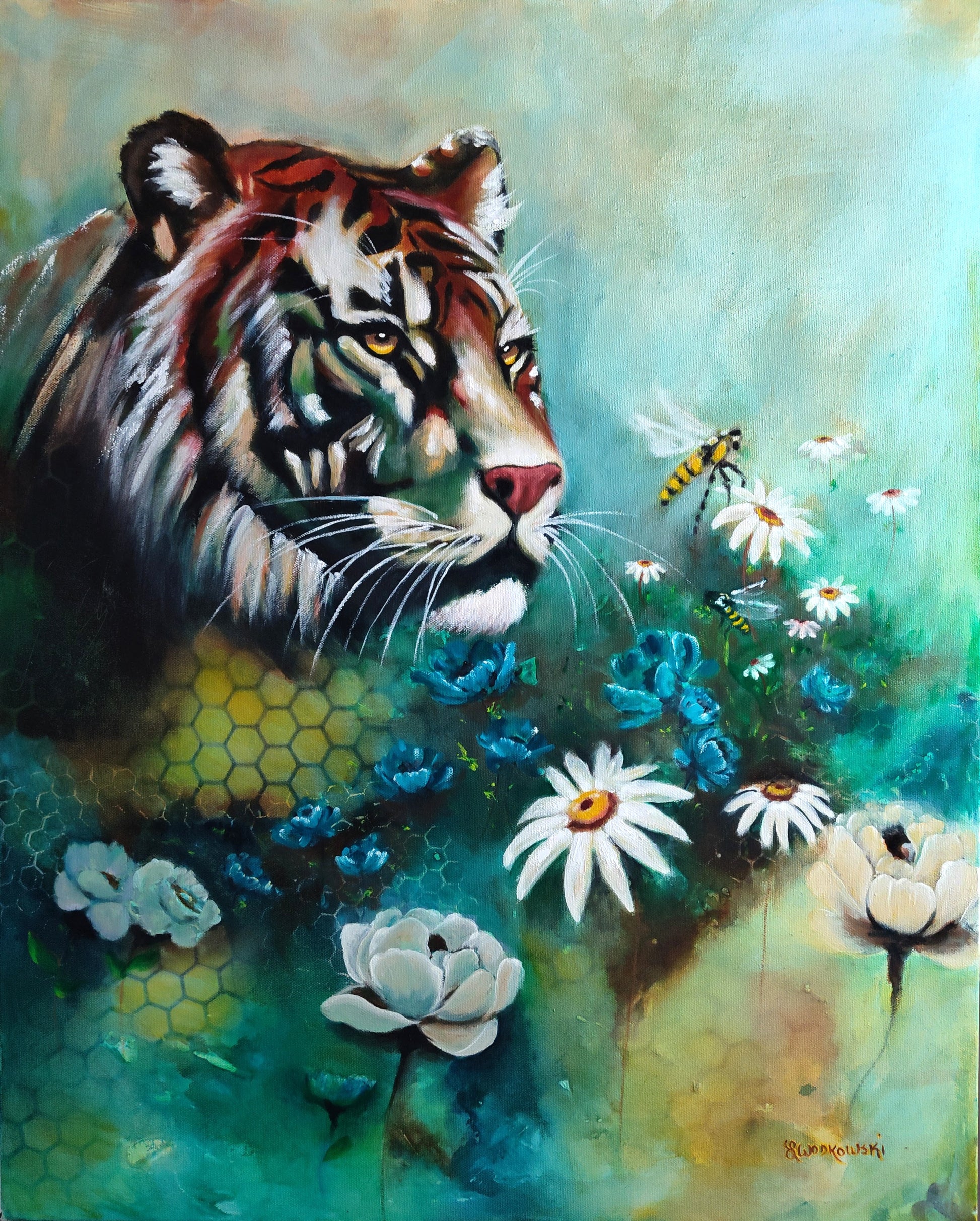 The tiger is in a rare moment of calm. Surrounded by wildflowers, bees, and soft honeycomb patterns, the tiger is present and observant rather than fierce. The bees and flowers hint at balance in nature and how even the most powerful beings exist within a delicate system.